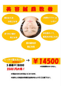 い・ほうれい線が気になる・お化粧のノリ、肌荒れが気になる・目の疲れが気になるなどお悩みでしっかり整えたい方にオススメの回数券になっております。