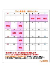 - 2025/12/26 お知らせ ジュン整骨院 1月カレンダーお知らせ・新年は1/5(月)より通常通り営業致します