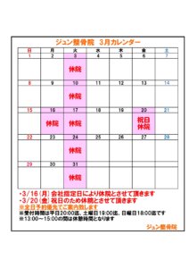 こんにちはジュン整骨院です! 2月のカレンダーをお知らせします 〇休院日 ・毎週火曜日 ・2/11(水)祝日のため休院とさせて頂きます ・2/23(月)祝日のため休院とさせて頂きます 別途、営業時間変更等ありましたら 随時お知らせいたします 冷えや乾燥により ☑血行不良 ☑身体の硬さ悪化 ☑代謝機能低下 が起こりやすくなっております 春に向けてしっかりこの時期にケアして 健康を損なわないよう対策しましょうね! ・・・・・・・・・・・・・・・・・・・・・・・