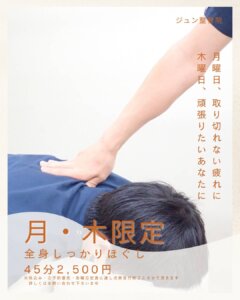- 2026/2/19 キャンペーン ジュン整骨院 月・木曜日は全身ほぐしサービス!
