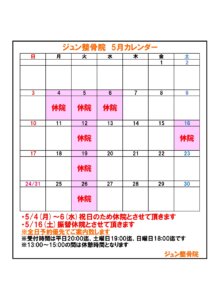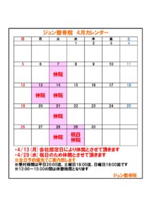 - 2026/3/27 お知らせ ジュン整骨院 4月カレンダーのお知らせ