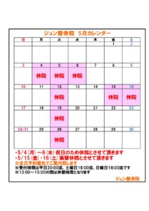 - 2026/4/23 お知らせ ジュン整骨院 5月カレンダーのお知らせ