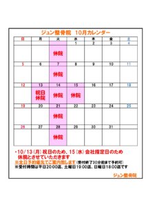 - 2025/9/26 お知らせ ジュン整骨院 10月営業日カレンダーのお知らせ