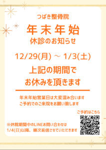 - 2025/12/21 お知らせ つばき整骨院鍼灸院 年末年始のお知らせ